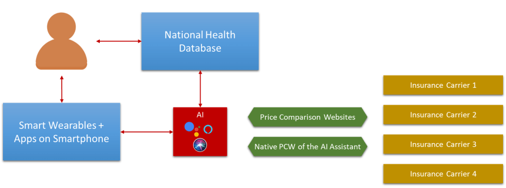 In addition to the activity data, national health databases such as NHS database in UK with the consent of user can be used by Health Insurance carrier for further assessment of risk. The database provides the user’s history of diseases and health concerns which is typically provided manually by the user at present. An AI assistant post authorisation can easily fetch this data through secured APIs and pass it to relevant carriers or PCWs. This helps both the user and the carrier as it leads to better risk assessment and also on user’s part reduces the chance of claim rejection on account of misrepresentation.
